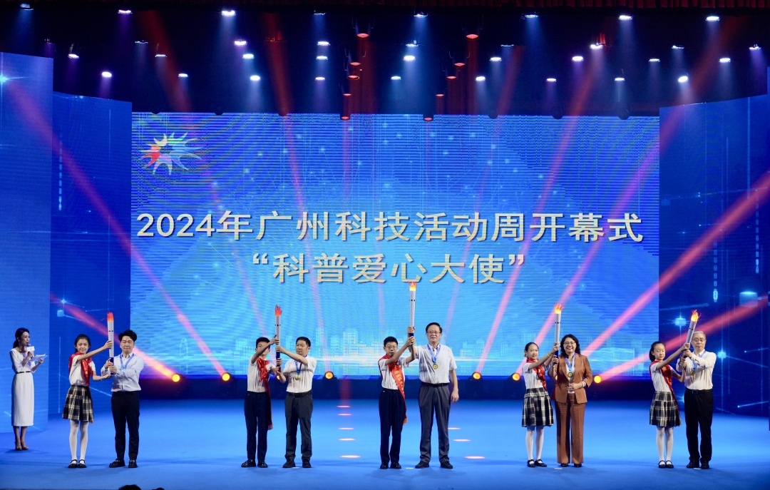 开幕式上,中国工程院院士陈勇等5位院士专家作为“科普爱心大使”缓步上台,与青少年代表一起点燃象征科学与创新精神的“科技传承”火炬。来自广东省科技厅、华南农业大学、广州市政府、广州市政协、广州市委宣传部、广州市科技局、广州市科学技术协会、天河区人民政府等省、市、区单位的代表一同出席开幕式。