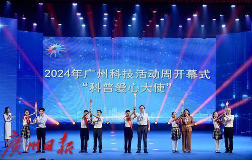 5月25日上午,广州科技活动周开幕式在华南农业大学丁颖礼堂隆重举行。 开幕式伊始,中国工程院院士陈勇等5位院士专家作为“科普爱心大使”缓步上台,与青少年代表一起点燃象征科学与创新精神的“科技传承”火炬。
