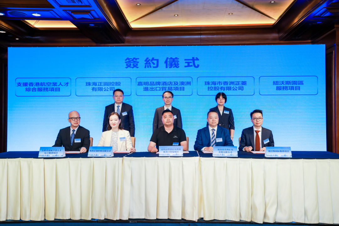 會上,富臨集團總部項目、紐沃斯園區服務項目、支援香港航空業人才綜合服務項目等9個項目現場簽約落地,涵蓋了餐飲、文化創意、服務貿易等重點產業方向,項目落地後將為香洲品質提升引入源源不斷的產業活水。
