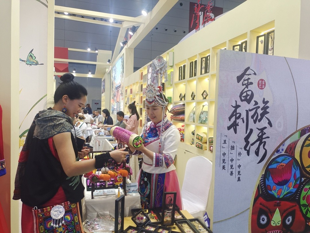 文博会召开来的几天,粤港澳大湾区馆畲族刺绣展台引起了不少爱美女性的关注,被称为“广东畲娘”的雷珺婷忙得不可开交,不断地向各位观众介绍畲绣的历史、技艺和特色,既传播了畲族文化,也结交了不少朋友。