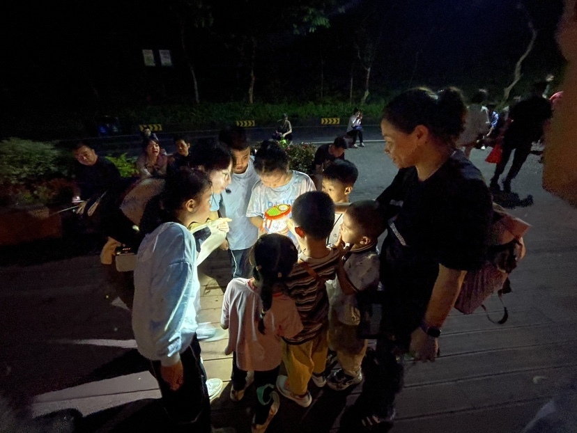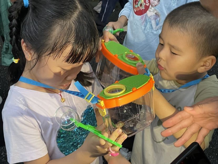 夜间徒步白云山展开虫虫趣味互动观察的独特体验,让亲子家庭兴奋不已。大家借助带灯放大镜、昆虫观察盒、镊子等工具,在草丛、土壤、灌木等区域寻找、观察和认识蚯蚓、蚂蚁、蜗牛、蝉蜕等自然界不同物种,发现不一样的自然魅力。