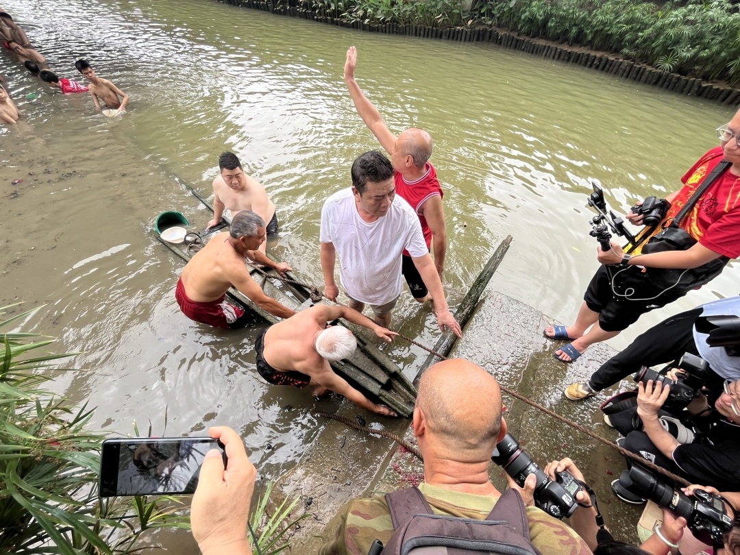 起龙仪式开始后,张锦志领着儿子缓慢走入河涌里,在父亲和其他村民的指导下,父子携手一起打捞“村宝”。