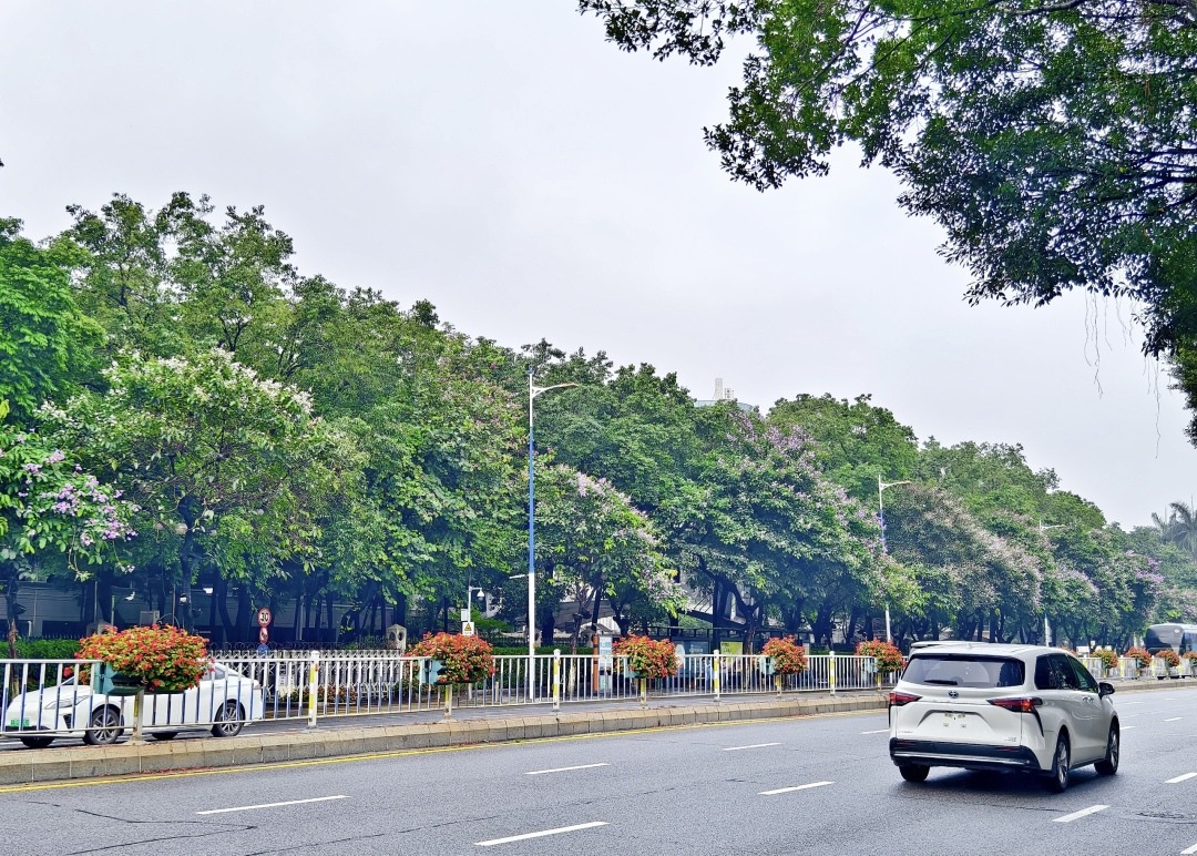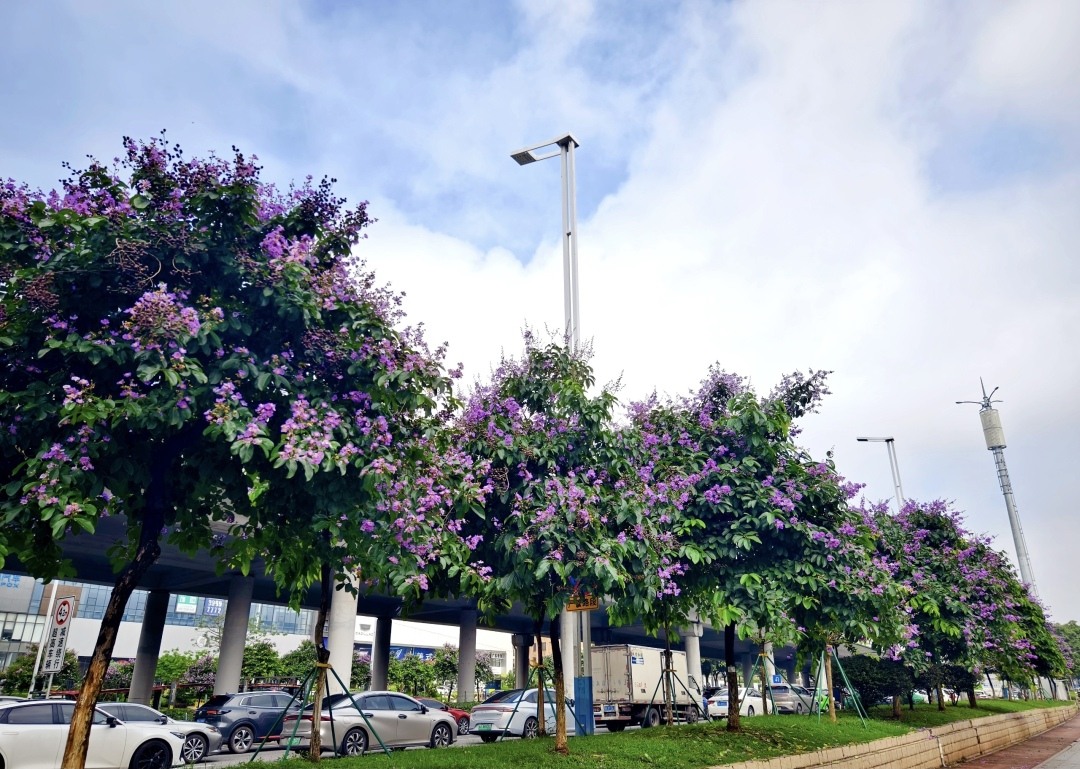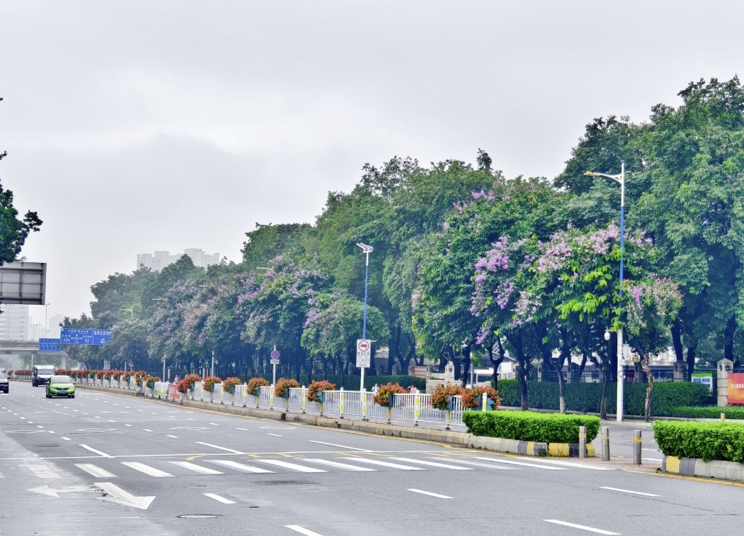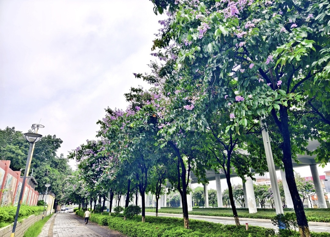 番禺大道甘棠村至龙美村段,一株株大叶紫薇被粉紫色的花朵缀满