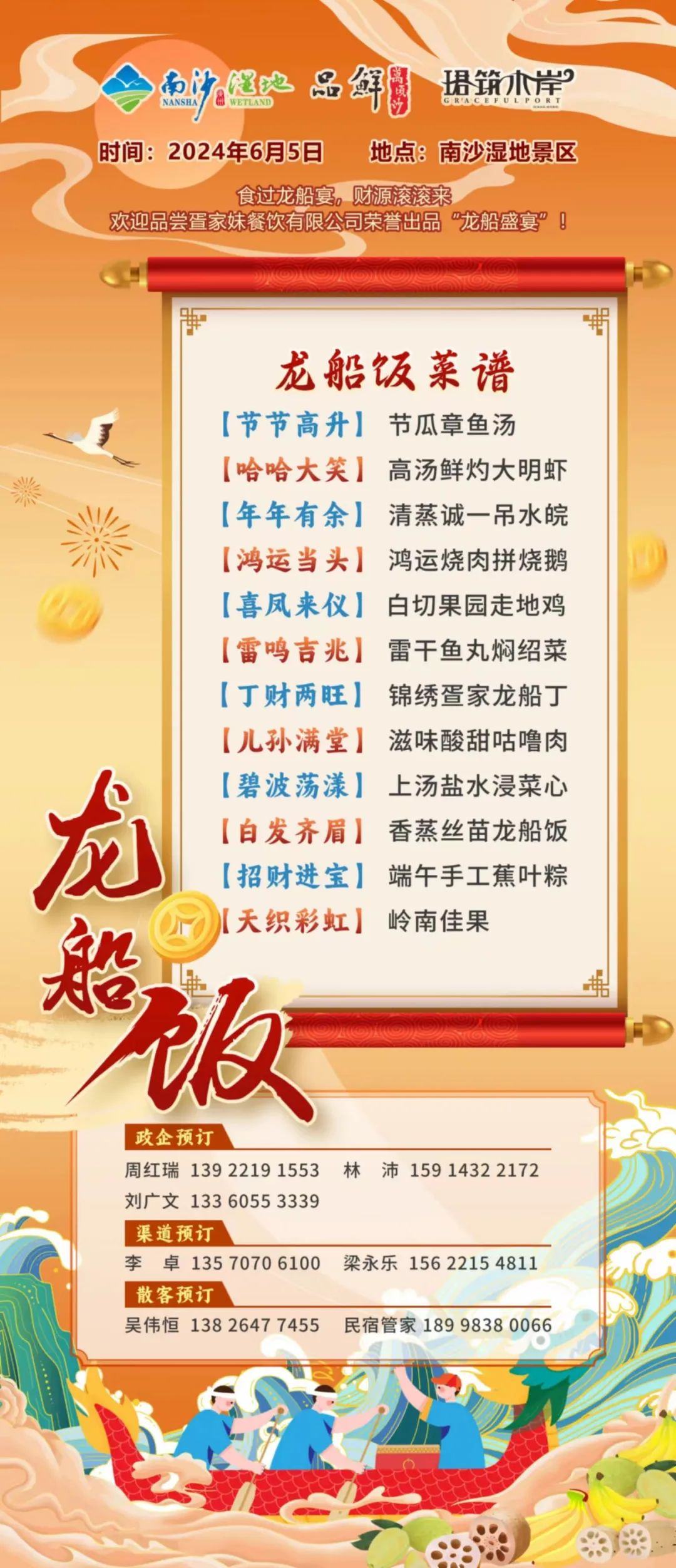 端午千人龙舟饭今年难得是龙年,龙年吃龙舟饭,顺风顺水又顺财!作为南沙湿地龙舟比赛的重要子活动,千人龙舟饭于6月5日在南沙湿地景区榕荫大道举行,将设置150围围餐,参赛者、嘉宾、游客共襄盛举,共同品味龙舟饭的独特风味,感受传统文化的魅力。