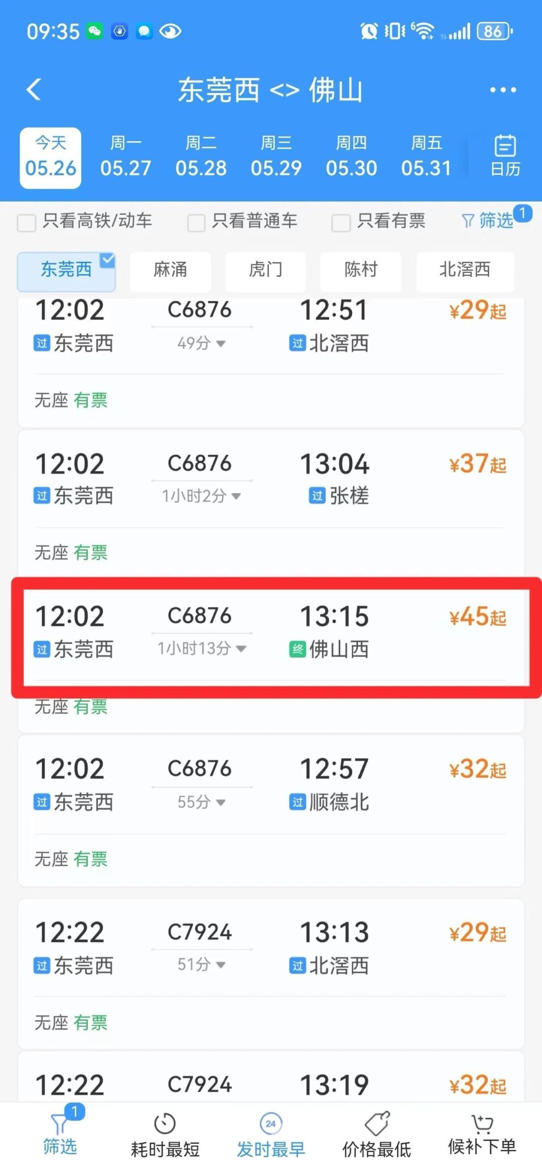 ▲佛莞城际(东莞西站-佛山西站)全程票价为45元