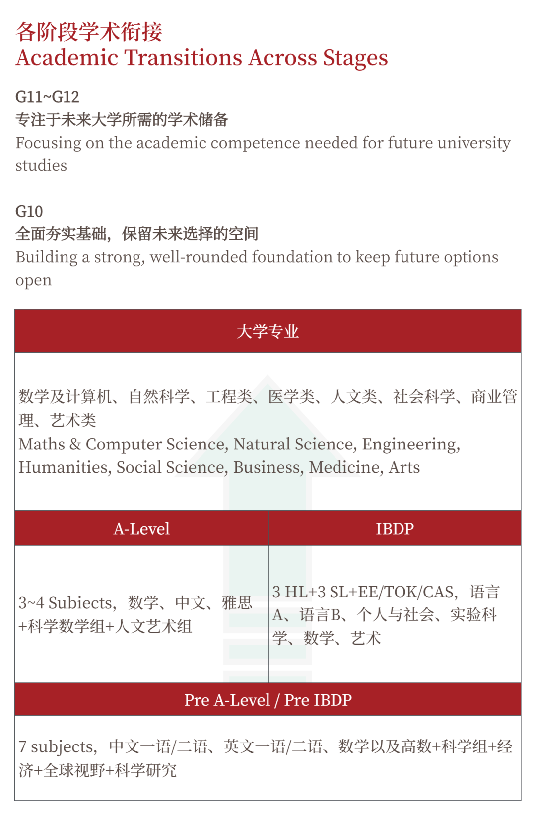 同时,学校秉承“以终为始”的课程设计原则,针对海外大学不同专业的需求,为学生提供G10-G12连贯的培养方案,在G10设置Pre A-Level及Pre IBDP课程,全面夯实基础,保留未来选择的空间。