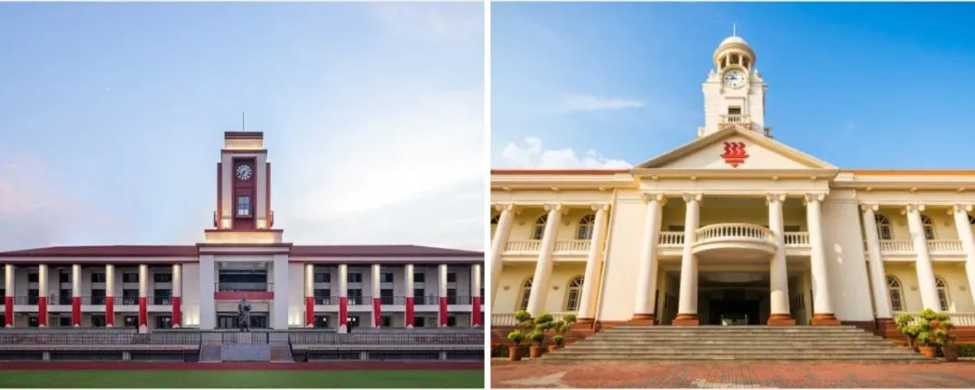 △广州市新侨学校钟楼(左)与新加坡华侨中学钟楼(右)