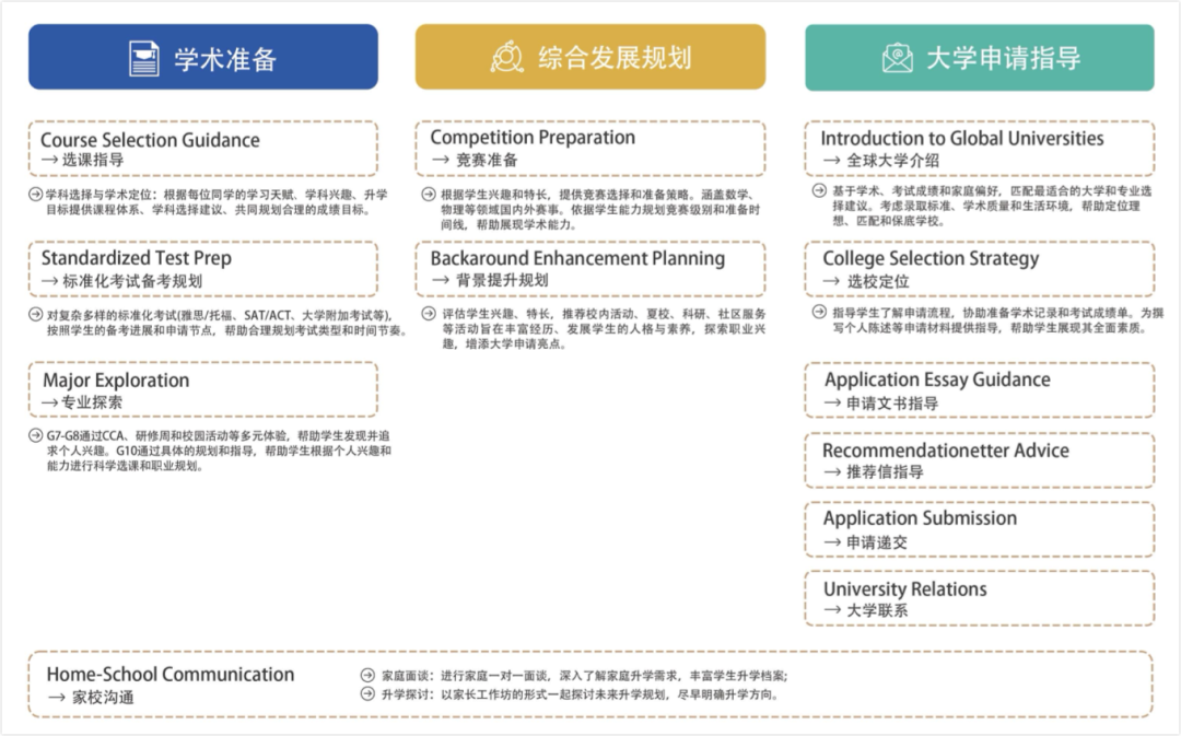 学校升学指导团队在每个升学关键节点为每个学生提供并迭代升学方案,做到个性化定制升学路径;在升学方案中会帮助学生梳理学科优势、职业目标等,并以终为始建议学生参加竞赛及社会实践、社区服务,提前准备语言考试等,为未来升学提前积累优势。