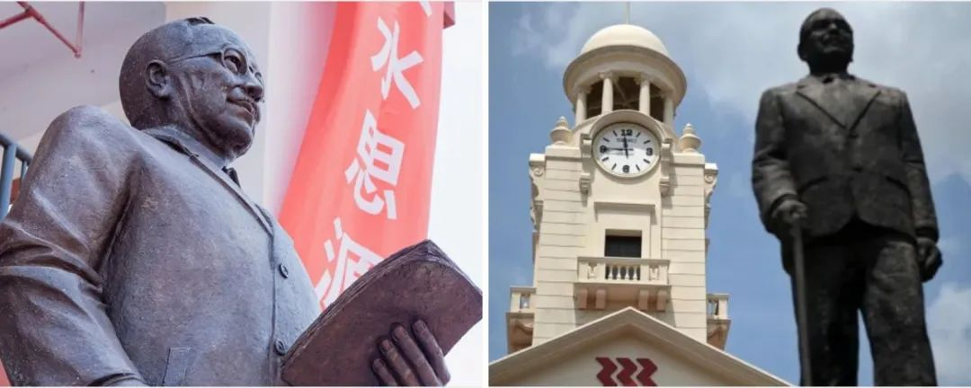 △广州市新侨学校为纪念嘉庚先生修筑铜像(左);新加坡华侨中学的嘉庚铜像(右)