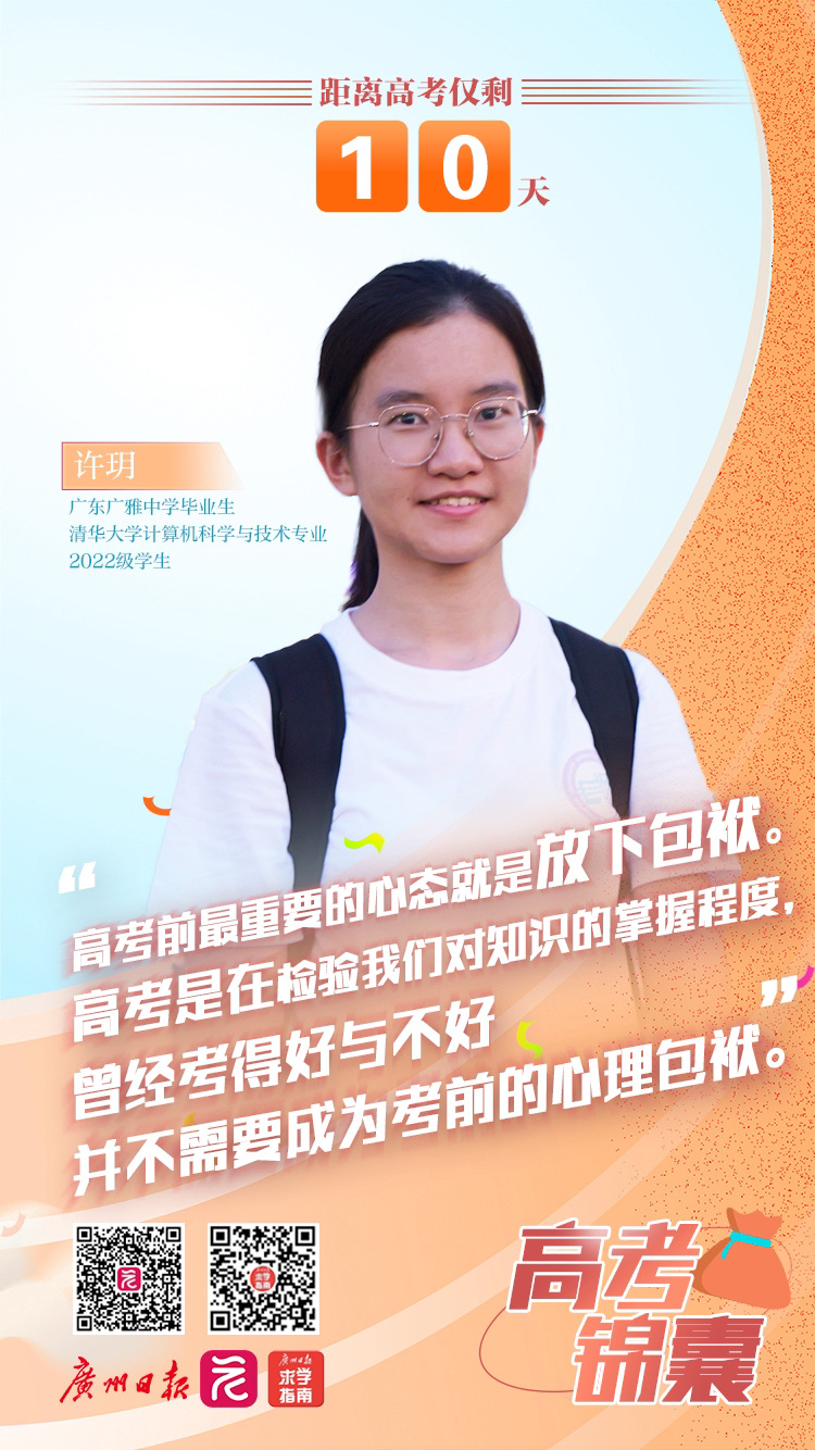 在高考倒计时之际,广州日报邀请到多位在近两年的高考中取得优异成绩,现就读于清华大学、中山大学、香港科技大学(广州)、华南理工大学、华南师范大学、南方科技大学、广东工业大学、深圳技术大学、广州美术学院等高校的学生,为广大学弟学妹分享他们在高考冲刺备考期间的经验和策略。