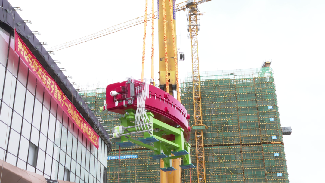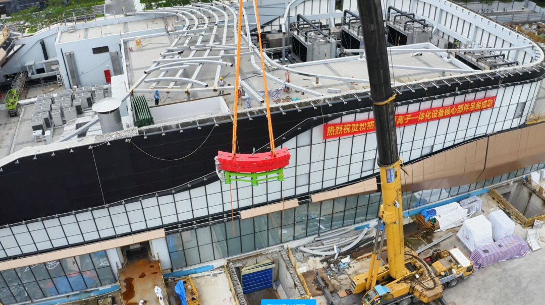 在和祐质子重离子中心的吊装现场,记者看到,该设备长达4米、重达20吨的核心部件——偏转磁铁缓缓升起,从位于质子重离子中心楼顶的吊装口精准吊入,与基座平行吻合。