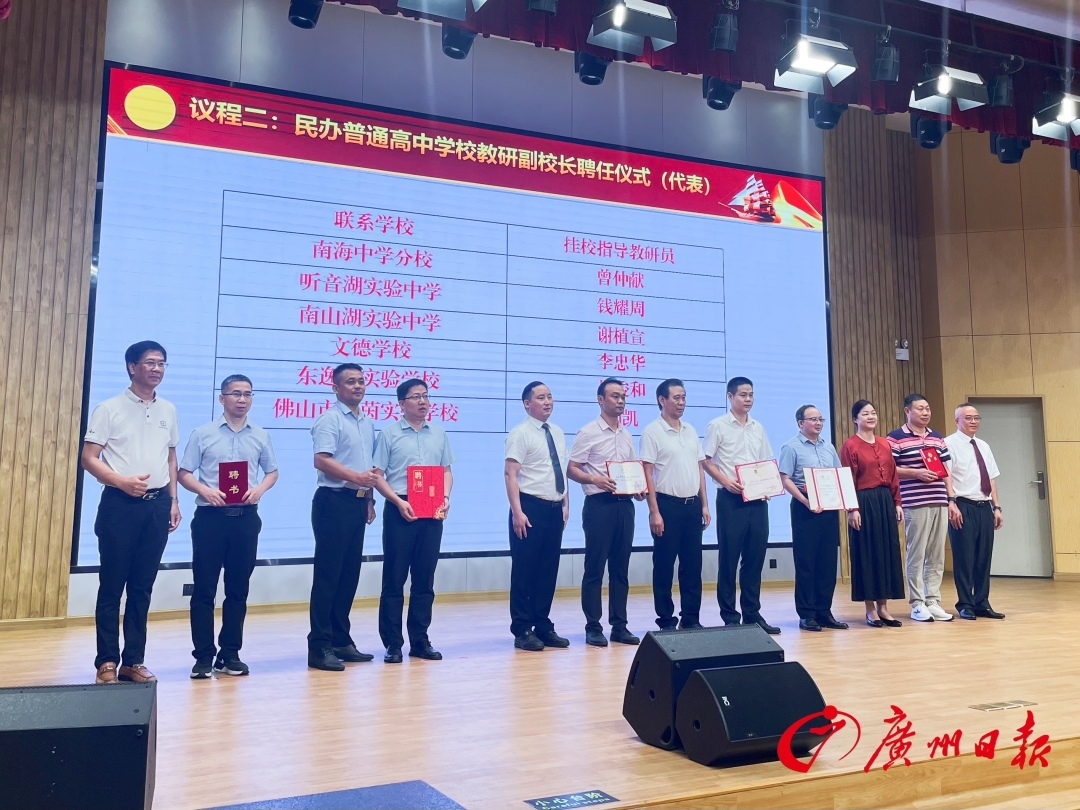 活动还举行了民办普通高中学校教研副校长聘任仪式。根据安排,此次有19所民办高中将迎挂校指导教研员,包括岭南美术实验中学、南海中学分校、南海区南执高级中学、华附南海实验高中、佛山市超盈实验中学、金石实验中学、英广实验学校、听音湖实验中学、南山湖实验中学、德胜学校、文德学校、碧桂园学校、国华纪念中学、东逸湾实验学校、佛山市萌茵实验学校、北博德翰外国语学校、华大星晖高级中学、惟德外国语实验学校。