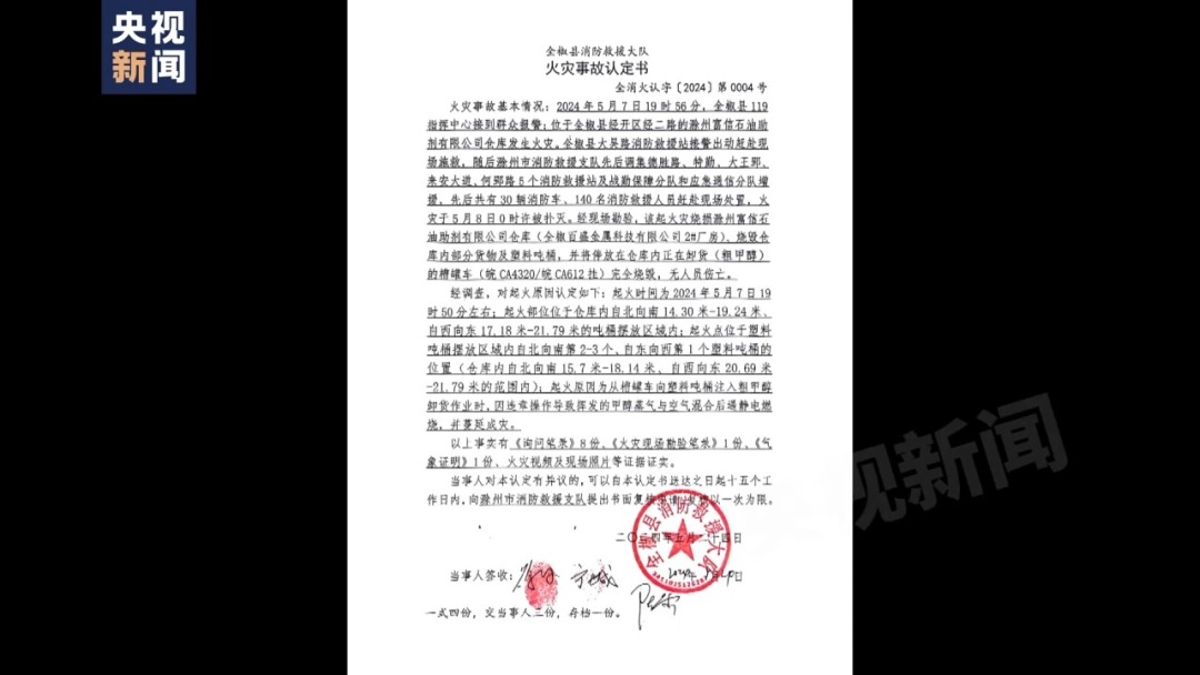 记者从全椒县消防救援大队于5月24日出具的火灾事故认定书上发现,5月7日晚上7点多,滁州富信助剂有限公司仓库发生火灾,滁州市消防救援支队调集30辆消防车、140名消防救援人员现场处置,火灾于5月8日0时许扑灭。经现场勘验,该起火灾烧损滁州富信石油助剂有限公司仓库、烧毁仓库内部分货物及塑料吨桶,并将停放在仓库内正在卸粗甲醇的槽罐车完全烧毁,无人员伤亡。