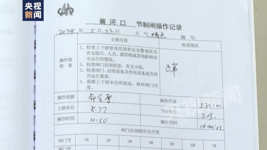 记者在安徽省驷马山引江工程襄河口闸管理所的节制闸操作记录本上看见,发现在5月18日上午,这里的节制闸原本已处于完全关闭状态。然而在发现水体污染的两天后,5月22日上午10点50分,襄河口七孔节制闸中的五孔开闸,在闸前聚集两天的污水一路畅通地进入滁河。这一次放水直至5月23日15点50分结束,时间长达29个小时。