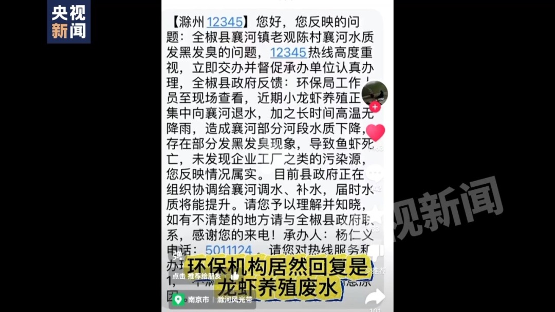 记者:但是我看到了有一个滁州12345,关于全椒县襄河镇老观陈村襄河水质发黑发臭问题的回复,留的承办人叫杨仁义。