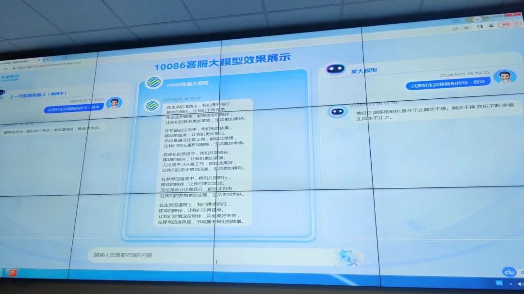 不仅可以答疑,还能吟诗。现场演示以“以美好生活移路相伴写一首诗”,不一会儿,10086客户大模型洋洋洒洒写出了几百字的文章。