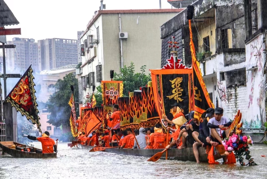 值得关注的是,与追求“竞速”的扒龙舟不同,容桂龙舟注重“竞美”,即游龙趁景,气态万千的游龙是力与美的展示——游龙多由“龙头”“龙身”“龙尾”组成。端午期间,各坊社的游龙汇聚在河涌里,走街串门、你来我往,河道成为最热闹的交通方式。