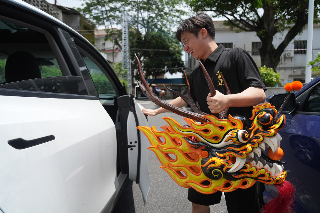 王子小心翼翼地把龙头作品搬上自己的小车“特拉拉”上,有时后排不够位置,“副驾驶位也是龙头作品,还要为它系上安全带。”他打趣道。据悉,他的小车有一套龙头制作工具“百宝箱”,可以随时变成“流动工作间”,他对龙头制作的喜爱可见一斑。