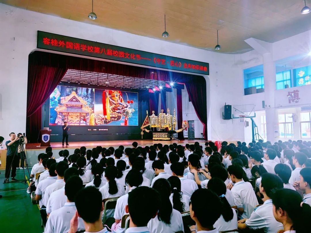 今年4月初,王子受邀到容桂外国语学校开展《守艺·匠心》非遗传承讲座,在讲座伊始,他和学生们来了一场“破冰”。在介绍过程中,王子演示了龙舟鼓法,同学们积极互动,上台进行鼓法表演,现场气氛热烈。