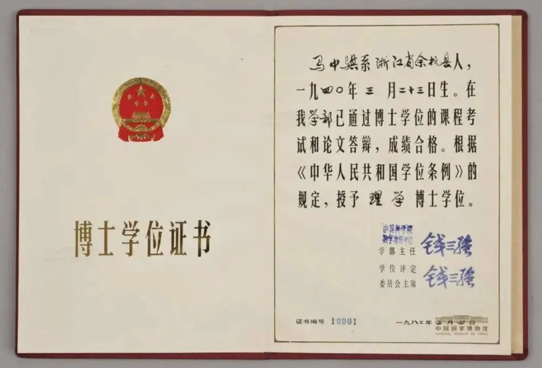 “南方周末”微信公众号去年11月曾刊文《“新中国第一号”博士》介绍了马中骐先生的人生故事。文章介绍,马中骐来自中国科学院高能物理研究所,核物理学家、时任中国科学院数理学部主任、学部委员钱三强签发了他的博士学位证书,证书编号是“10001”,新中国第一号。现在,这份学位证书被中国国家博物馆收藏。