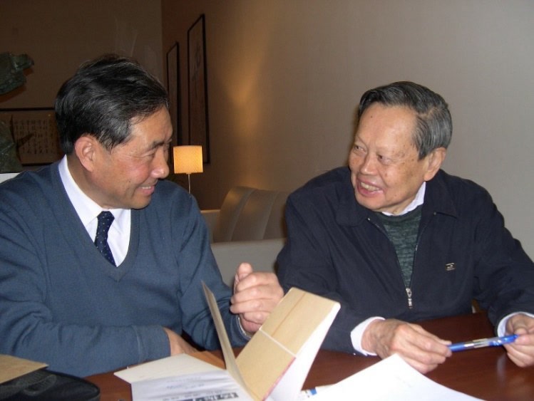 2004年马中骐(左)在清华大学杨振宁先生家讨论理论物理问题