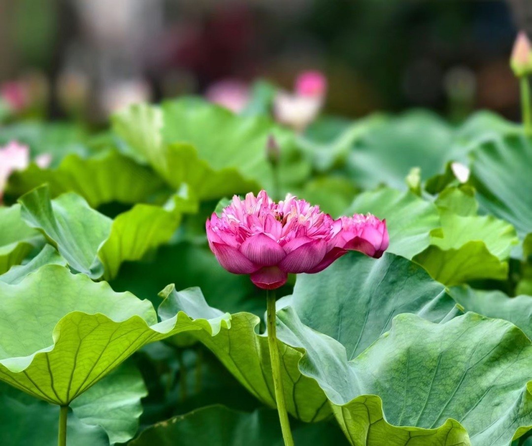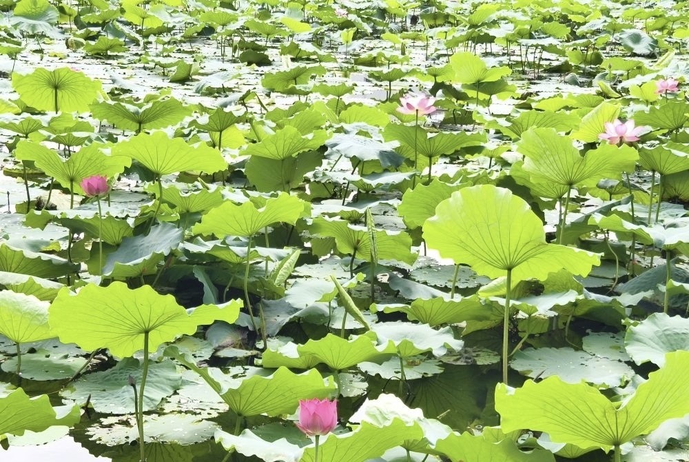 在东环街蔡一村北街坊大街,这里的荷塘又是另一番景色。荷塘里的荷叶碧绿,层层叠叠,绕着塘堤生长,粉嫩的花朵点缀在绿意盎然的荷叶丛中,给美丽乡村增添了一抹绚丽的色彩。