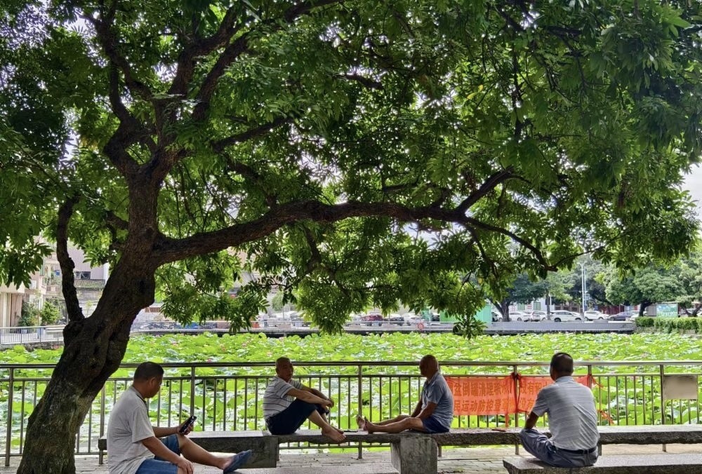 5月29日,记者来到石碁镇塱边村的西约大街,池塘里的荷叶绿了,层层叠叠,高低错落,一朵朵粉红色的荷花伸展出来,与蓝天白云相映,微风吹来,荷香四溢。三五成群的村民坐在荷塘边的榕树下纳凉、聊天,悠闲自得。