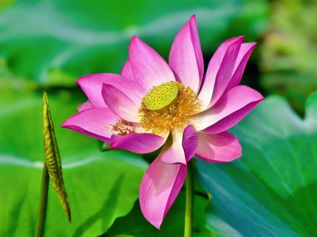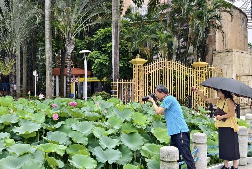 在亚运大道金海岸花园,路边的池塘里荷叶翠绿、荷花争艳,吸引过路的街坊驻足观赏,摄影发烧友从不同角度拍摄荷花美景。