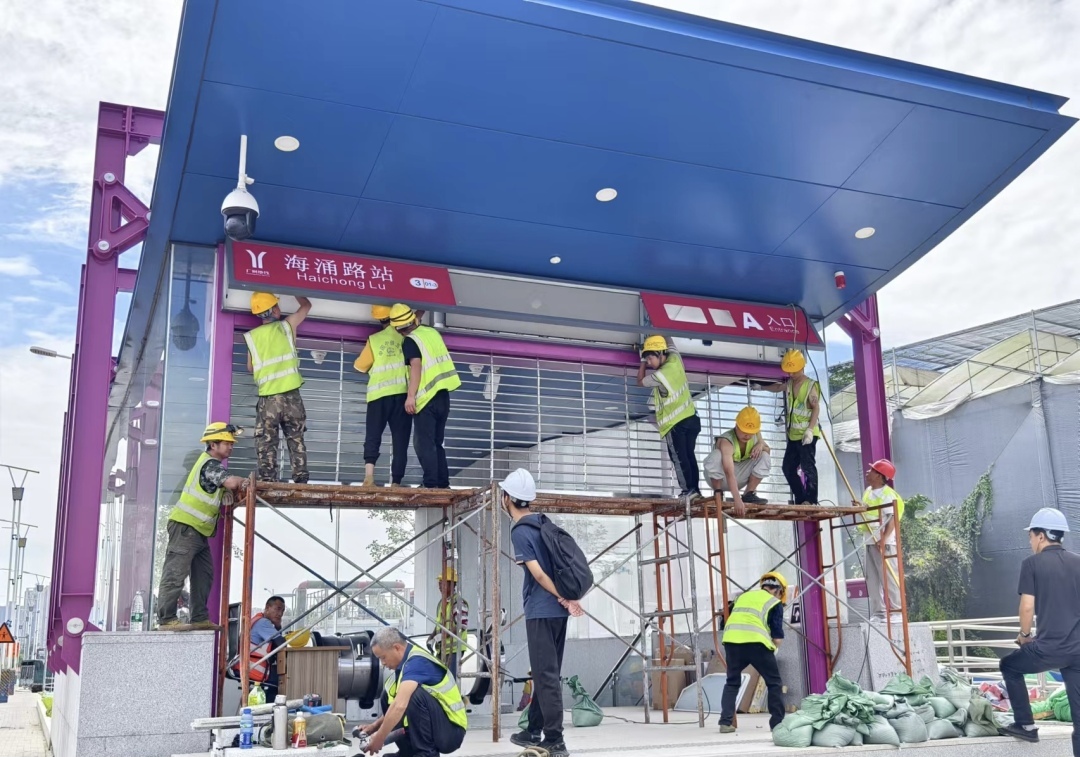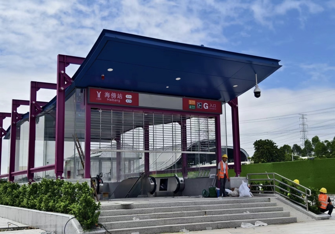 在广州地铁3号线东延段海涌路站的A、B入口,施工人员正在挂海涌路站的站名。在广州地铁3号线东延段海傍站,新建的E、F、G三个入口也挂上站名,这三个新建的入口既是3号线的入口,也是4号线的入口,3号线和已开通的4号线在海傍站可以换乘。