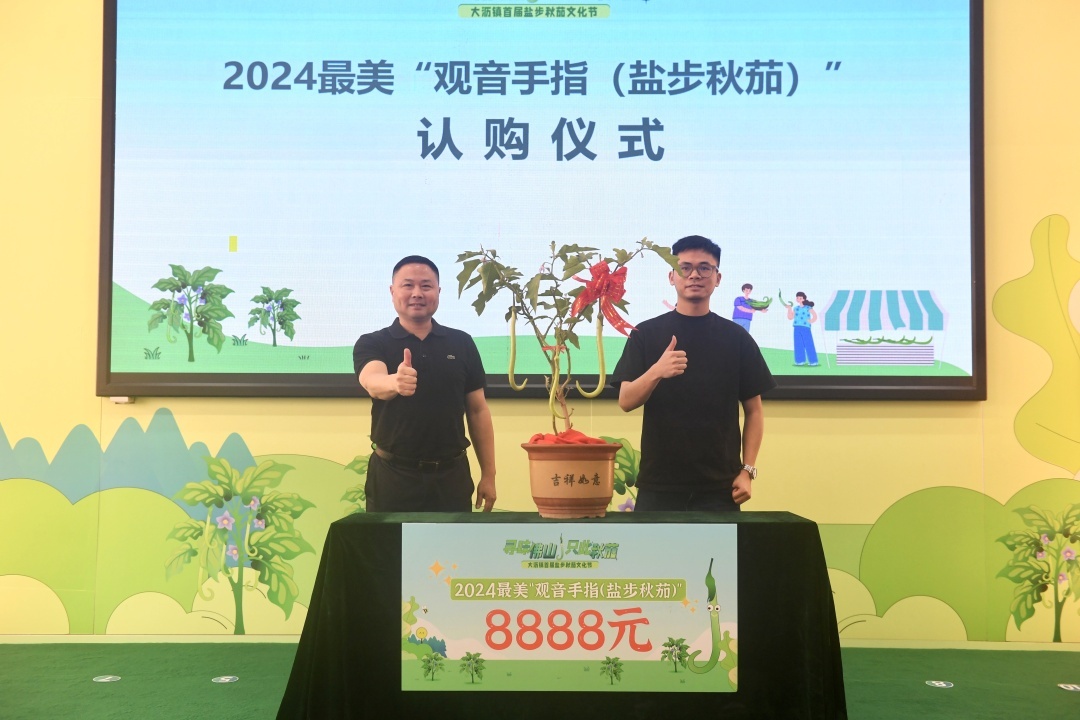记者在本次活动现场看到,每个餐饮商家都展示了自家特色秋茄晏,数十道以秋茄为主角的菜品琳琅满目,让人目不暇接。展厅中最为耀眼是舞台中间那棵“秋茄王”,颜色翠绿、线条优美,是经过多位“种植能手”从众多成熟的秋茄树中精挑细选的一颗。长润餐厅一直钻研秋茄美食的研发,对盐步秋茄品质的认可,以8888元的价格认购了这颗2024最美“观音手指(盐步秋茄)”。