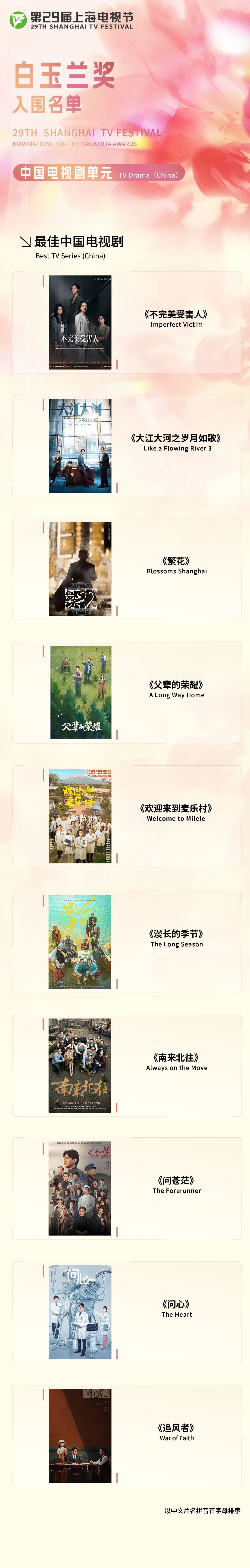除了《繁花》,入围“最佳中国电视剧”的还有《不完美受害人》《大江大河之岁月如歌》《父辈的荣耀》《欢迎来到麦乐村》《漫长的季节》《南来北往》《问苍茫》《问心》《追风者》。
