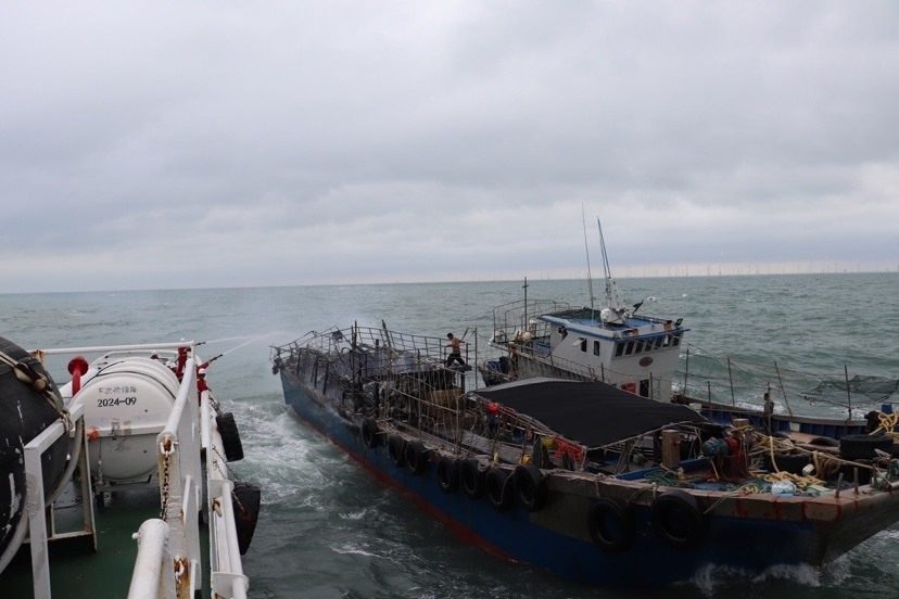 救助船于15时40分抵达事发海域,当时现场东风七级,浪高4米,能见度7海里。救助人员在现场了解到,失火渔船为“粤湛渔04388”,船上有4名渔民,当时还有其姊妹渔“粤湛渔01069”在帮助灭火。救助人员随即采用专业消防皮龙对失火渔船进行灭火作业。经现场人员协同努力,失火船火势在半小时后得到有效控制,未见明火,但仍有烟雾弥散。