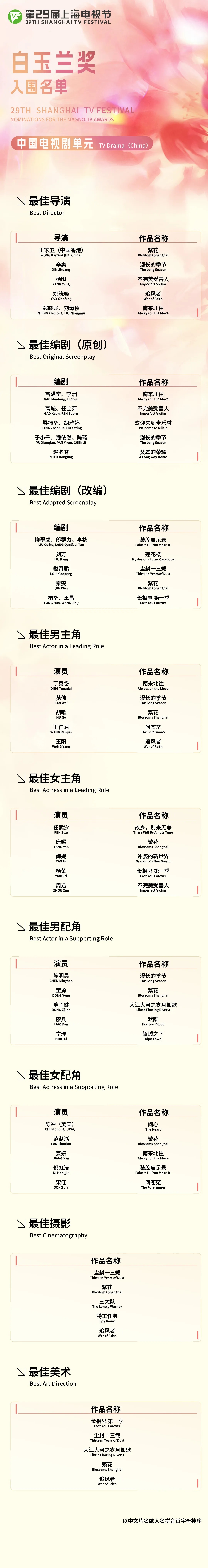 第29届上海电视节白玉兰奖入围名单公布,《大江大河之岁月如歌》《繁花》《父辈的荣耀》等10部作品入围最佳中国电视剧提名名单,各大奖项将于6月28日晚揭晓。