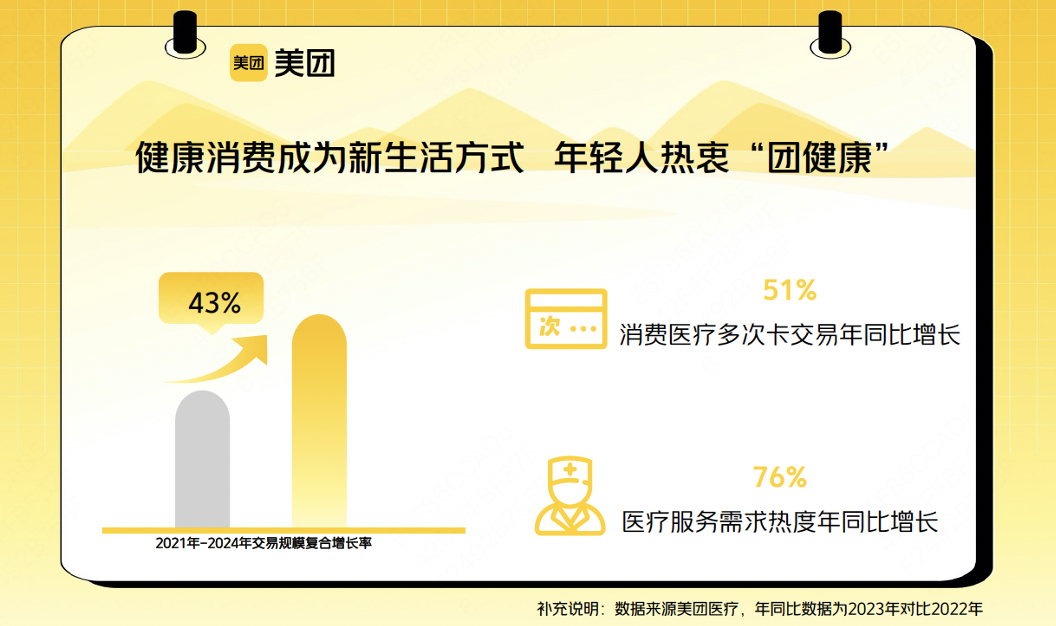 从节假日洗牙、干眼SPA、验光服务到中医把脉,持续涌现的健康需求,正在成为消费增长的“新引擎”。据美团数据,从2021年至2024年,平台上消费医疗的交易规模复合增长率达到43%,二次及以上团购的多次卡交易增速达到51%。