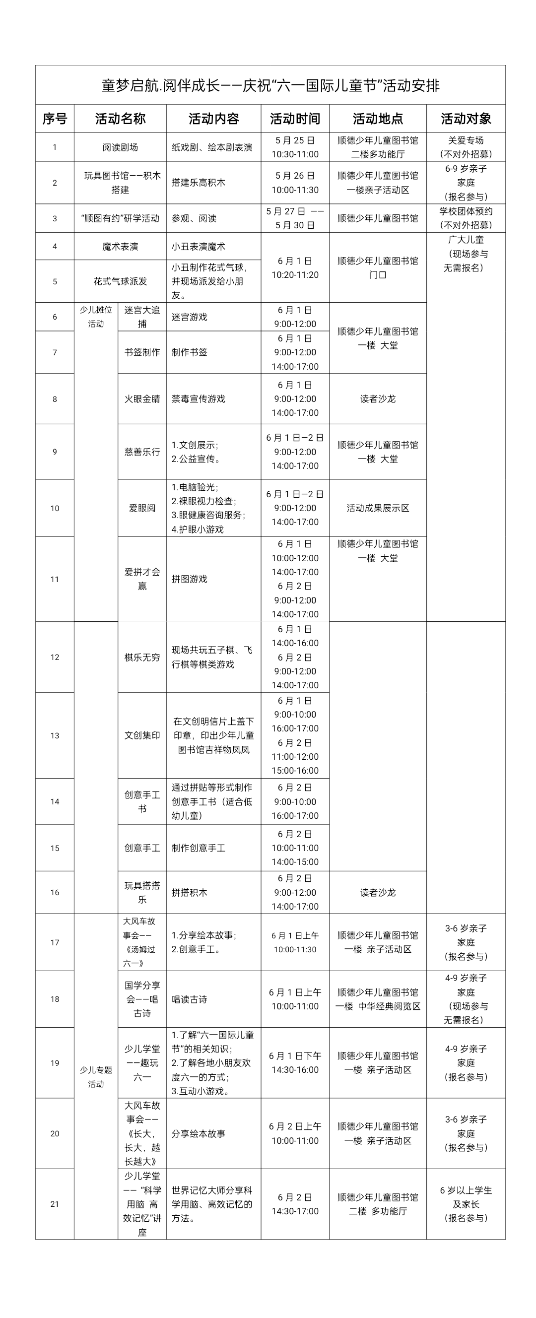 记者了解到,系列活动于5月25日-6月2日期间在顺德少年儿童图书馆举办,内容包括:阅读剧场(“纸戏剧”、儿童剧表演)、“顺图有约”研学活动、少儿摊位活动(爱拼才会赢、文创集印、“棋乐无穷”、玩具搭搭乐、“爱眼阅”、创意手工等)、“少儿悦读营”系列活动等。