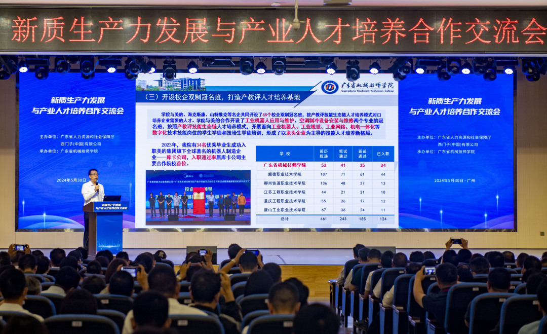 5月30日下午,广东省人社厅联合西门子(中国)有限公司在广东省机械技师学院江高校区举行“新质生产力发展与产业人才培养合作交流会暨智能制造产教评技能人才双选会”。双选会共吸引101家企业招贤引才,提供超2000个岗位,线上参与人数达1.4万人次,现场入场求职1200人次,线上线下共投递简历达6000多份,初步达成就业意向达1300人次。