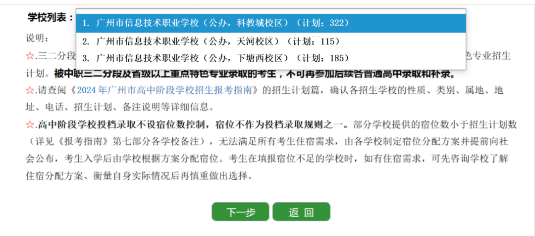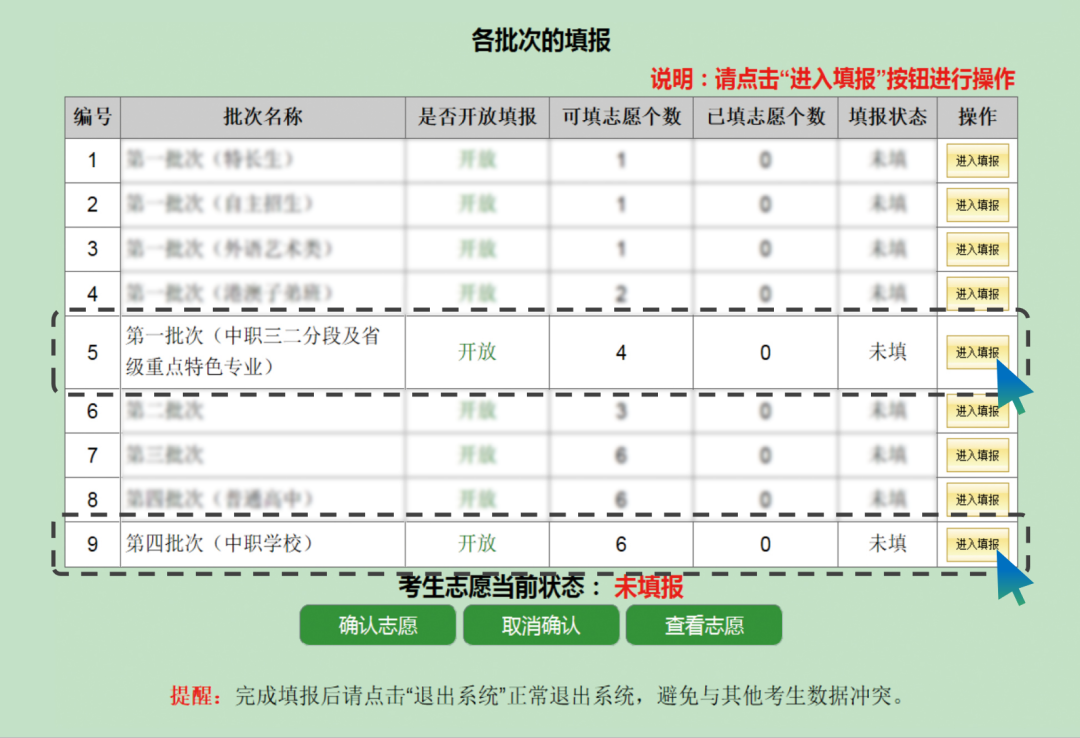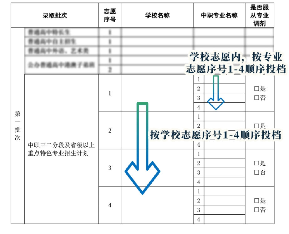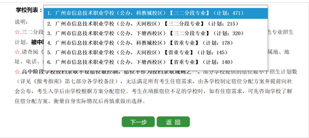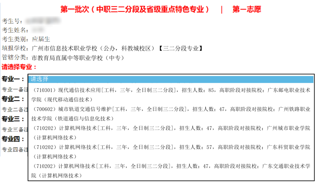 (1) 第一批次的中职部分:填报4个学校志愿,每校可填报4个专业。不同校区占不同学校志愿,同一校区的【三二分段专业】和【省重专业】占不同学校志愿。