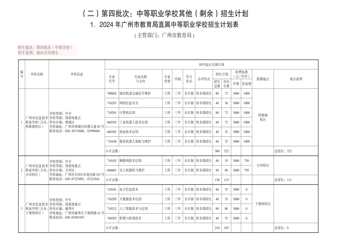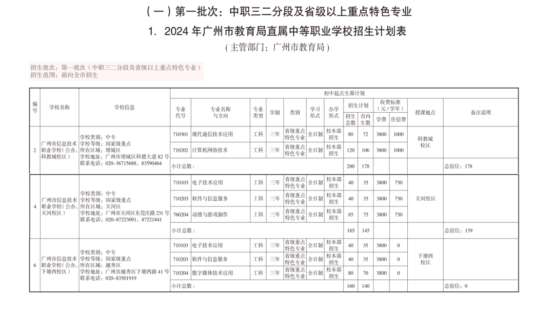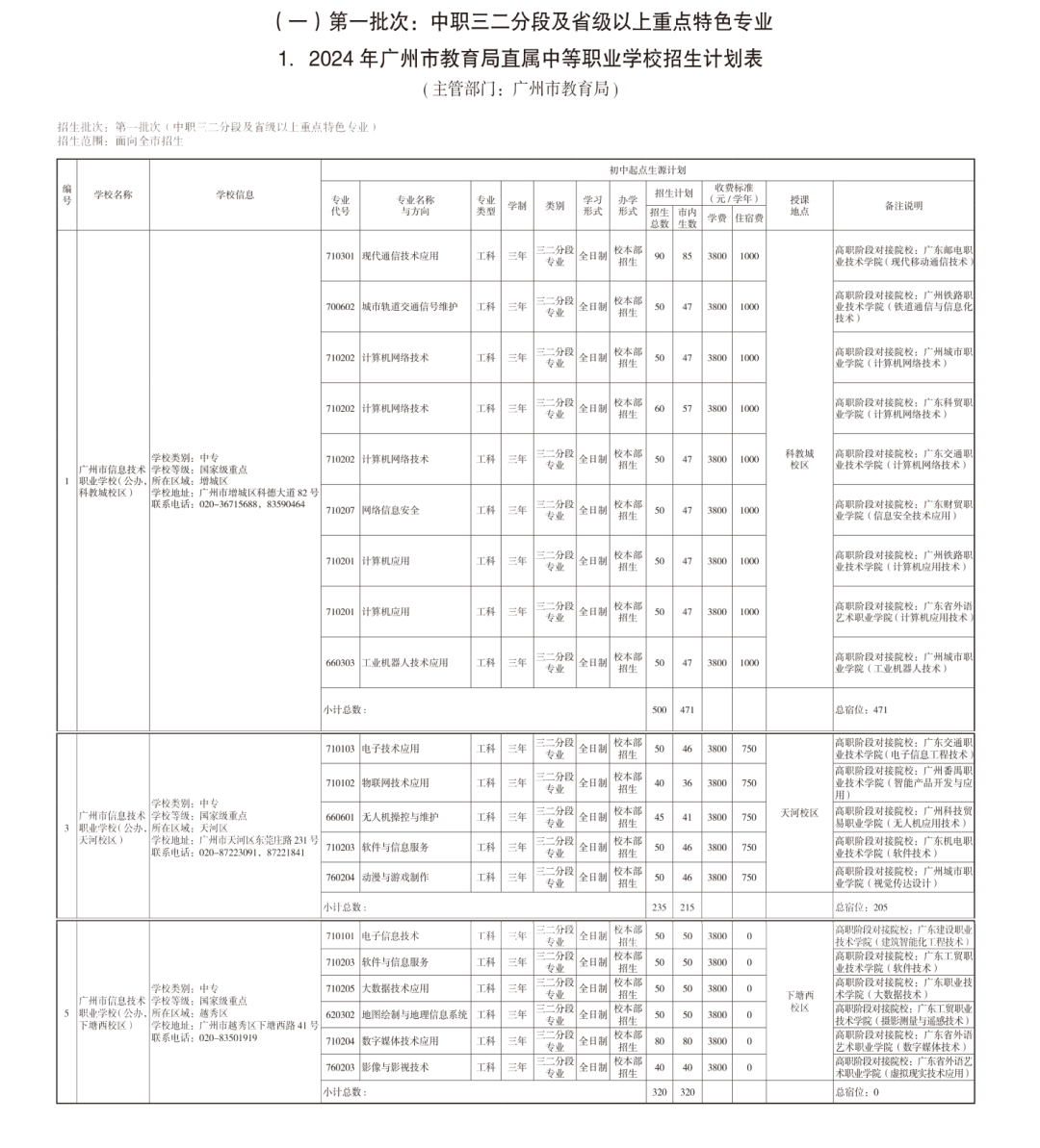 2024年广州市中考志愿分为四个批次,考生可在第一批次的“中职三二分段及省级重点特色专业”、第四批次的“中职学校”填报我校志愿。