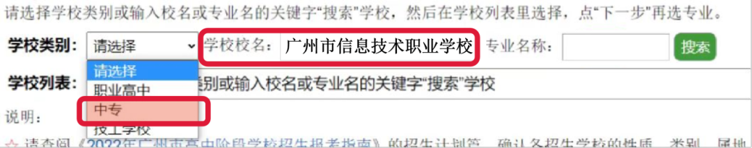 (3)点击【操作】-【填报】,通过选择“学校类型”为“中专”,搭配我校名称“广州市信息技术职业学校”即可在学校列表获取我校信息。