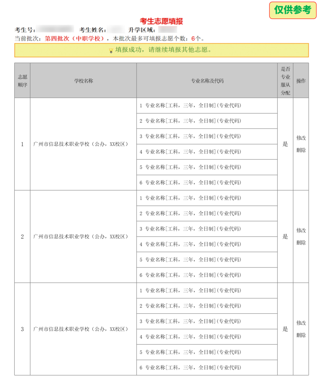 (3)多个学校志愿、多个专业志愿请注意填报顺序,有先后之分,按批次序号和志愿序号从1开始依次投档录取。如意向报考学校,欢迎在中职志愿的第一学校志愿报考!