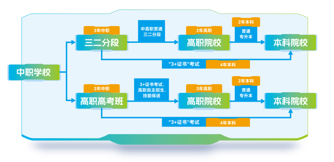 三二分段,高职院校和对口中职学校,联合行业企业,共同制定五年一体化人才培养方案。录取的应届初中毕业生先在中职学校就读3年,转段考核通过并符合相关条件和要求的,可进入对口的高职院校对应专业学习2年,高职毕业后可获全日制大专毕业证书。同时,三二分段学生还可以在中职第三年通过“3+证书”考试考取全日制本科院校。