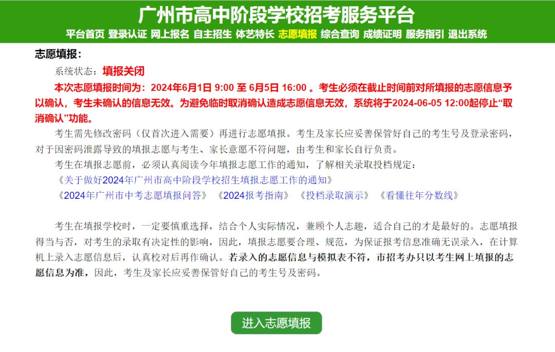 考生凭考生号、密码或通过粤省事登录“广州市高中阶段学校招考服务平台”填报志愿。填报志愿时间:2024年6月1日9:00至6月5日16:00。