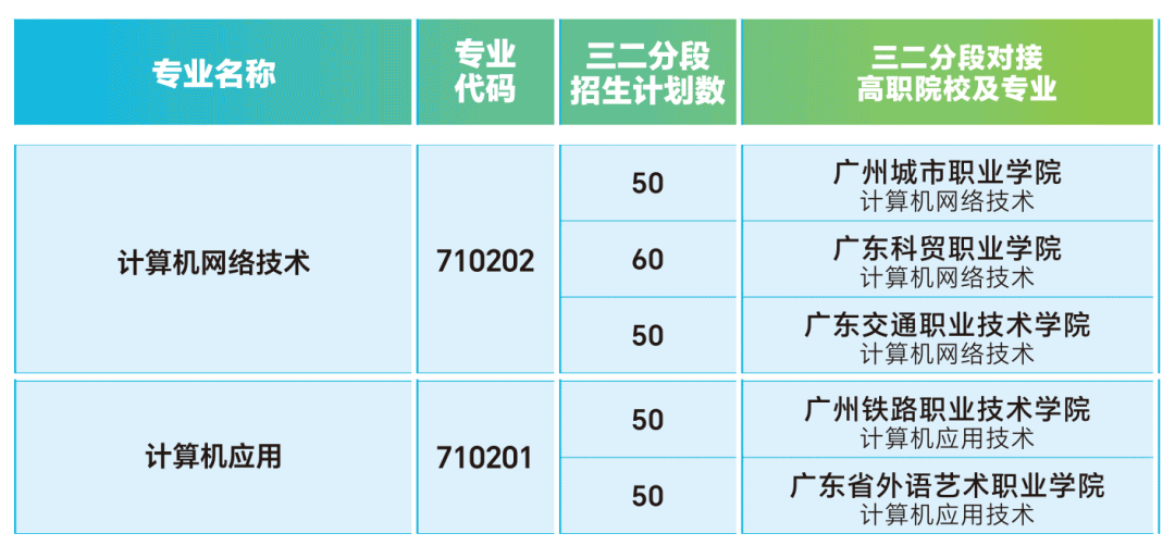 2024年,学校共计划招收2280名初中毕业生,其中,与广州番禺职业技术学院等13所省内知名高职院校开展中高职贯通三二分段试点合作,共有1055个优质培养计划,带你一站式直通全日制公办大专。