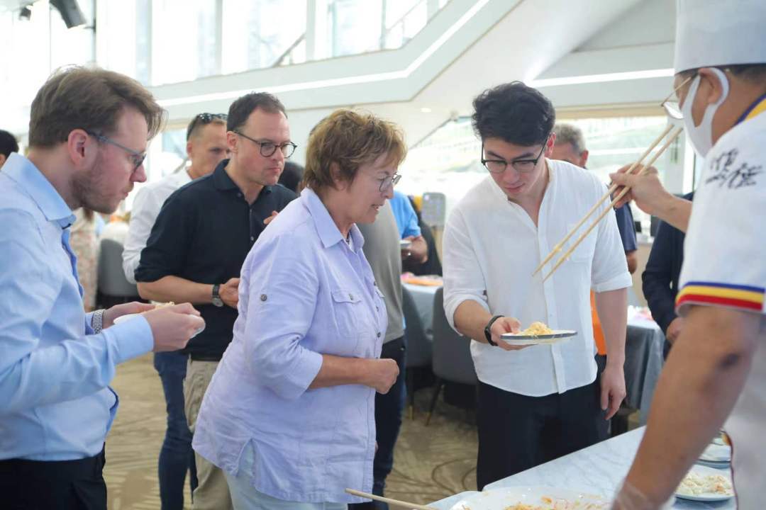 值得一提的是,“顺德美食现场展示”成为了当天活动的一大亮点。三位“凤城美食”烹饪大师、传承人集中亮相,让德国代表团成员饱尝舌尖上的“顺德滋味”。中国烹饪大师、广东省“粤菜师傅”五星名厨吴南驹,中国烹饪大师、广东钻石名厨钟润超,陈村粉第二代传人黄志均现场分别制作了七彩烧汁鳝柳、顺德炒牛奶、捞起陈村粉等顺德特色美食,通过精湛的烹饪技艺,征服现场外宾的味蕾。