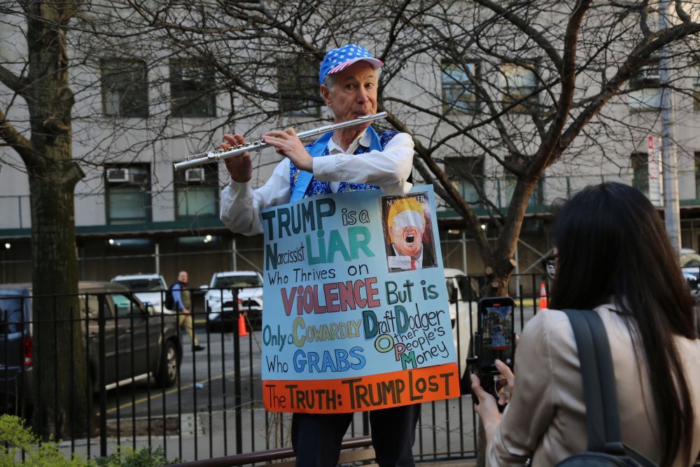 4月15日,在美国纽约,特朗普的反对者在法庭前的公园挂着标语牌演奏乐器。新华社记者刘亚南摄