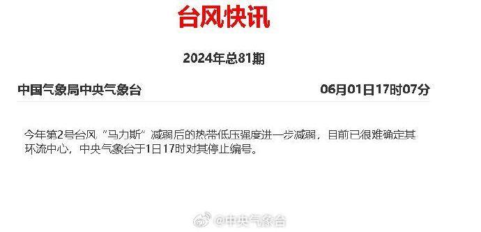 今年第2号台风“马力斯”减弱后的热带低压强度进一步减弱,目前已很难确定其环流中心,中央气象台于1日17时对其停止编号。“马力斯”虽停编,但广东、福建等地雨还是很大,需警惕地质灾害滞后性。