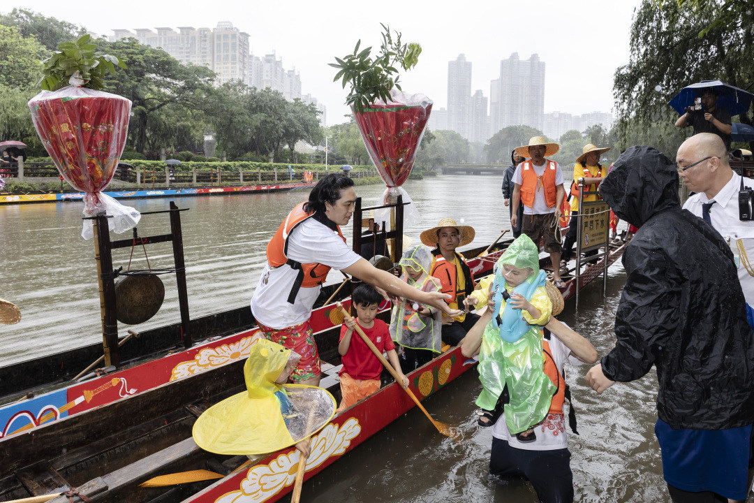 当六一国际儿童节碰上传统的龙舟采青仪式是什么场景?6月1日,广州市天河区珠江新城CBD热闹非凡,猎德村、石牌村举行一年一度的龙船采青仪式,虽然天下着雨,但不少“大朋友”仍带着小朋友上龙船,让年轻一代感受一把“扒龙舟”。