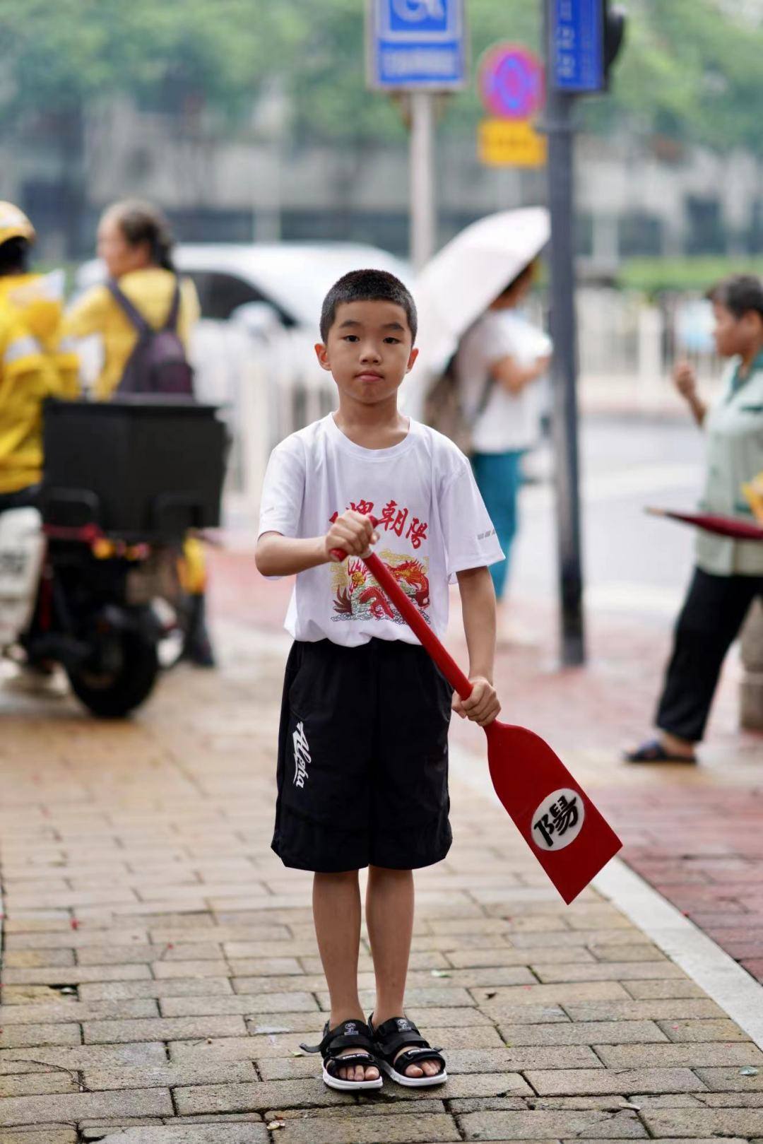 知道自己可以体验扒龙船的池睿扬小朋友,一早就拿着自己的小木桡,和爸爸从祠堂一路跟到河涌,迫不及待想要上船体验一把,他说:“本来今天下午要上英语课,但我求着妈妈请假也要来扒龙船”。