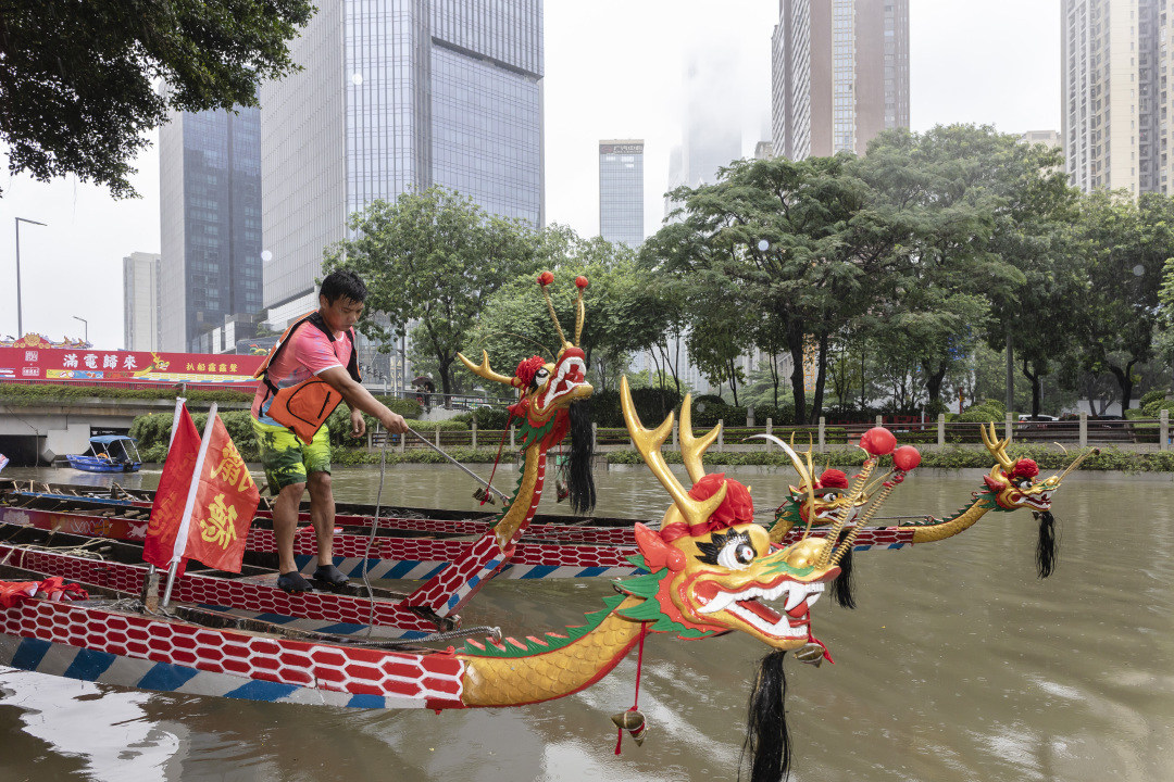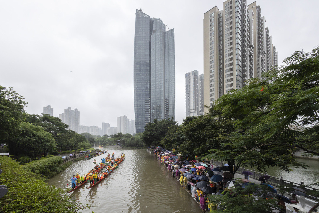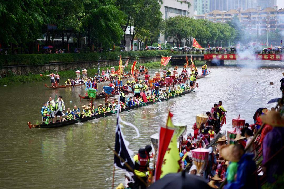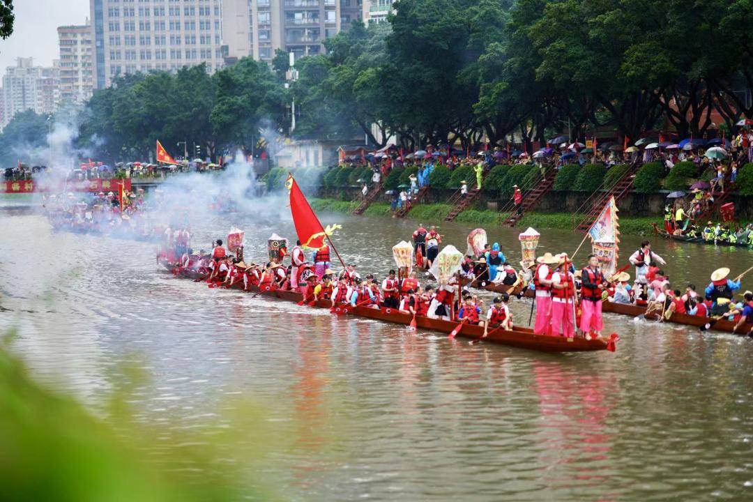 随后,锣鼓声响、鞭炮齐鸣,大家分工合作,挥旗的、敲锣的、打鼓的、划船的,龙船在河涌上来回游弋,“沉睡”的龙船彻底醒过来了。紧接着,他们出发前往珠江口,迎接2艘新龙船“回家”,不一会儿,8条龙船齐聚河涌上。岸边人山人海,鞭炮声、锣鼓声、加油声交织成一片,热闹非凡,8条游龙“飞驰”在珠江新城高楼间的河涌上。