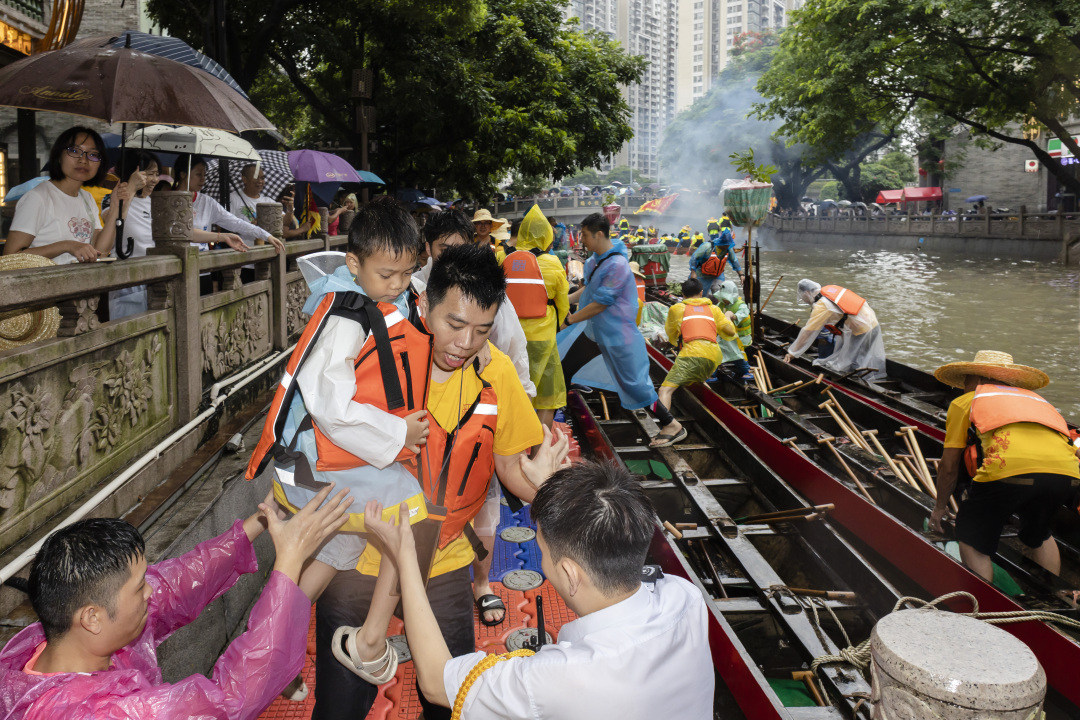 下午1点,猎德村一年一度的龙船采青仪式开始进行,村民们扛着龙头、龙尾、罗伞等,神采奕奕地向猎德涌出发。小朋友在大人的带领下,手持小木桡,身披雨衣,在龙船上划水的姿势有模有样。一位刚体验完“扒龙舟”的小朋友拉着爸爸妈妈:“我还想扒!”